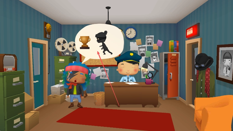 进入游戏场景后,和警察进行对话,注意对话气泡里关于小偷和奖杯的线索,从而确定需要寻找小偷以及被盗的物品。