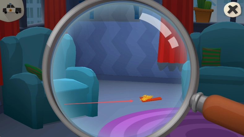 点击放大镜图标,进入搜索模式后,在房间里仔细搜寻,像在沙发周边找找梳子这类可能有问题的物品。