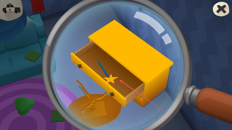 继续用放大镜开展搜索,留意诸如打开抽屉发现星形物品这类或许和案件有关联的道具,借助线索的收集来推动案件调查工作,最终揪出小偷并找回失窃的奖杯。
