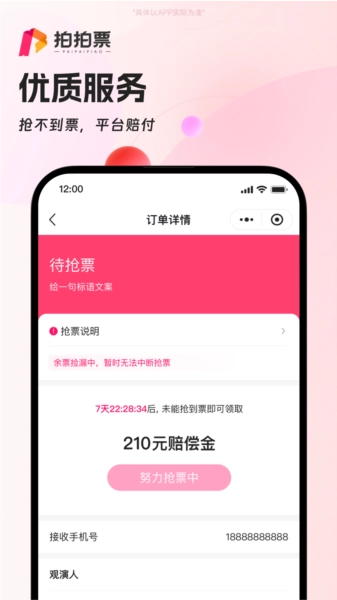 抢票保障计划:若用户未能成功抢到票,拍拍票代拍将履行赔付承诺,切实保障用户的合法权益。