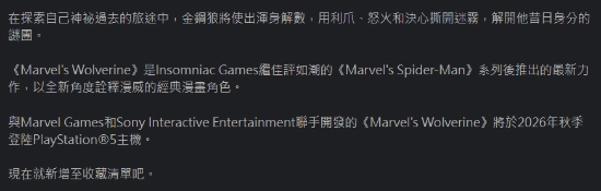 另一方面,从Insomniac过往作品来看,9月发售并非没有先例,像《漫威蜘蛛侠》系列的初代就是2018年9月7日发售的。而放眼整个2026年,目前索尼已确认的重磅第一方作品并不多,除了Housemarque的《沙罗周期》定档4月之外,下半年有较大空档,这也为《漫威金刚狼》在9月登场提供了理想空间。