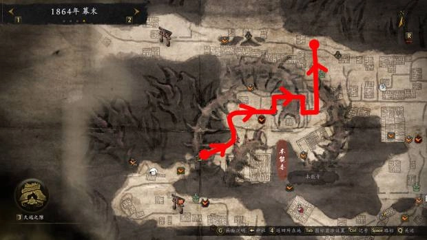 正式版测试与抢先版测试在测试路径上完全相同,可以参照对比。由于《仁王3》并未拥有内置基准测试工具,因此本次测试在游戏“1864年幕末”地图中进行,按照固定路线进行手动跑图,并使用软件记录帧数。跑图路线如上图所示,从本能寺左侧的篝火点开始,到地图上方的悬崖处结束。由于测试时已经手动清除地图上的BOSS以及小怪,所以测试过程中不会触发NPC战斗干扰。