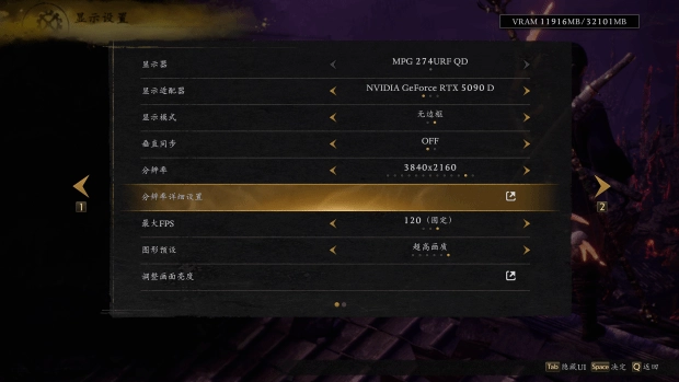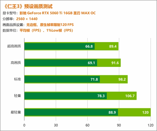 在测试过程中,我们将游戏画面选项全部调整为最高,关闭动态分辨率,开启DLSS,由于《仁王3》的DLSS选项为滑块,5%为一档,我们将渲染分辨率调整为65%,以模拟标准DLSS质量模式(66.67%)的表现。游戏仅支持窗口和无边框两种模式,因此测试在无边框模式下进行。此外,需要注意的是,游戏拥有帧数限制,默认为60 FPS,可以调高至120 FPS。不过由于游戏引擎问题,在120 FPS下部分场景或动作可能出现“慢动作”效应,我们建议玩家仅在60 FPS游玩该游戏。