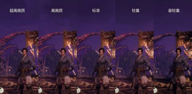 就画质表现而言,《仁王3》其实在虚化5引擎遍地走的今天算不上太出色。胜在氛围感营造得不错,到处布满了紫红色瘴气,颇有一种独特的风格。在默认的5个画质档位下,“超高画质”、“高画质”、“标准”、“轻量”四个档位并无太大差距,在材质细节以及光照方面有所衰减。通过测试我们也可以看出其帧数表现亦没有拉开明显界限,即便是从“超高画质”降至“轻量”,平均帧提升也仅有19%。“轻量”档位的画质几乎是难以直视,由于渲染分辨率断崖式地下降,整个游戏画面跟手游一般,最惊悚地是,连人物的眼珠都被优化掉了,导致角色看起来非常恐怖。