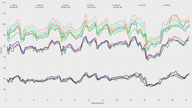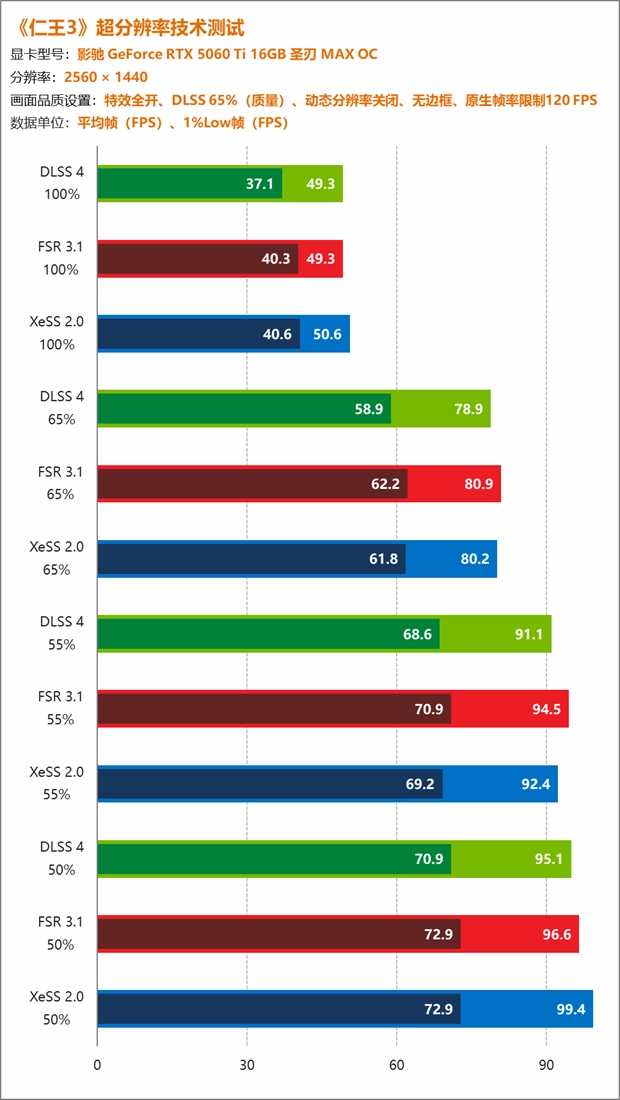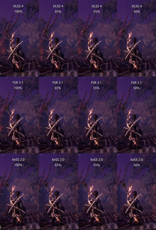 就超分辨率技术的性能表现而言,在100%原生档位以及65%质量档位上,三者并无太大差距,DLSS由于更吃性能,略低于红蓝两家数帧。在55%平衡档时,FSR 3.1的帧数要相对明显地高出一截。比较出人意料地是50%性能档位,采用AI机器学习的XeSS 2.0竟然在帧数表现上反超了只采用算法技术的FSR 3.1,看来《仁王3》在“最轻量”档位上将DLSS切换XeSS 2.0不无道理。