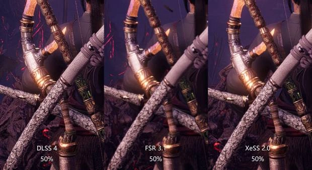 画质方面,不出意料,虽然是第一代Transformer模型,但是吊打FSR 3.1以及XeSS依然轻轻松松。在50%性能档下,DLSS 4拥有远超FSR 3.1的清晰度,武器纹路非常锐利。FSR 3.1则具有明显地肉感,XeSS 2.0虽然也是基于AI机器学习的超分技术,但想要赶上DLSS还有几年路要走,实际画质介于DLSS 4与FSR 3.1之间。