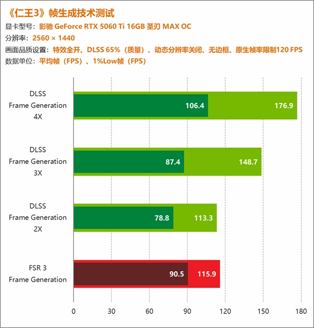 此外,我们还顺带测试了一下游戏的帧生成技术,由于帧生成技术的优劣只能在动态场景下才能更好地呈现,图文形式难以展现,仅提供帧数表现供大家参考。可以看出,FSR 3帧生成技术的平均帧与DLSS 2X相近,不过low帧却领先不少。