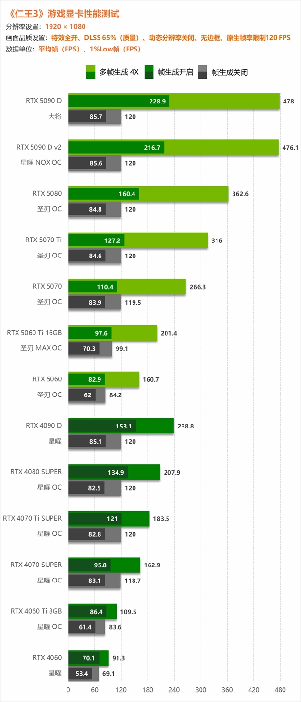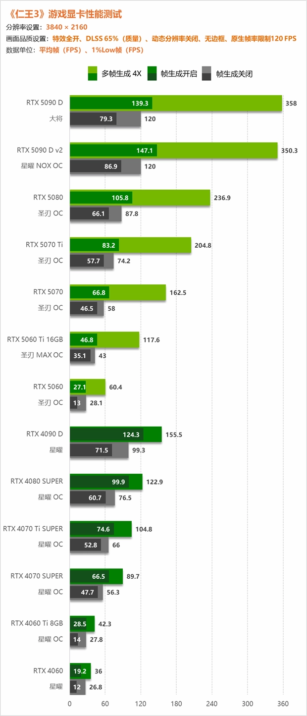 在开启帧生成后,由于RTX 5090 D/D v2性能余量较大,基本实现了英伟达官方宣传的4倍2帧率提升,而RTX 5080、RTX 5070 Ti在不开启帧生成的情况下就已经“力竭”了,所以无法腾出太多性能用于帧生成,效果相对略差。
