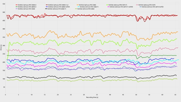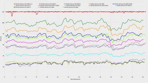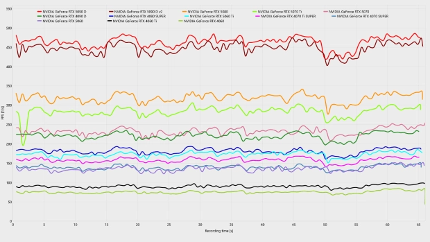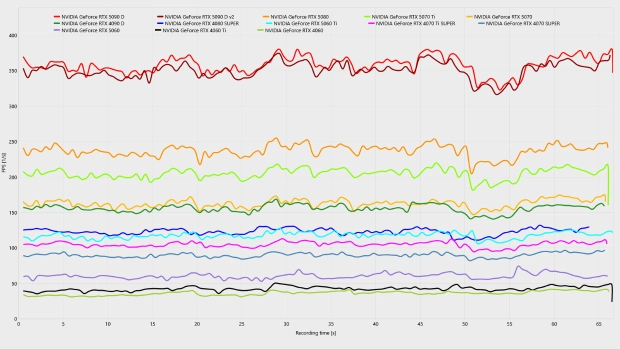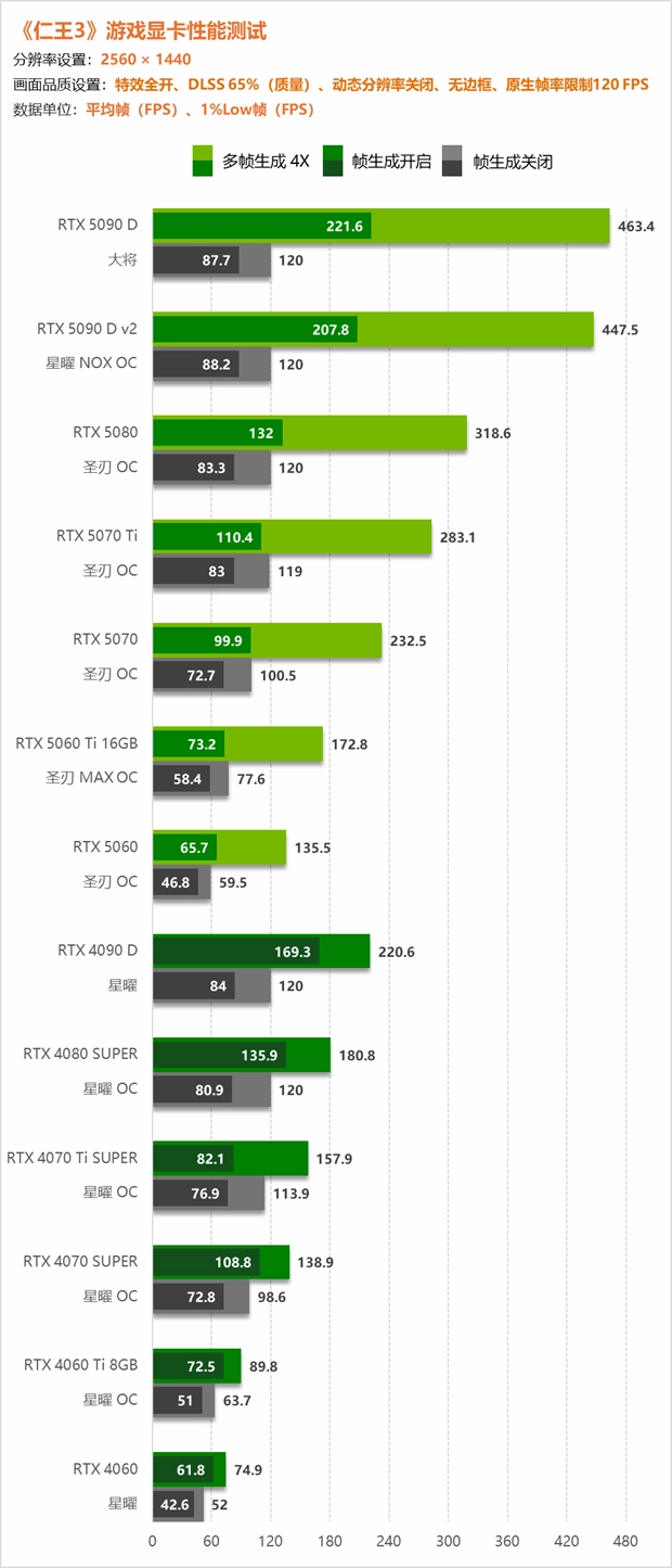 在1080P分辨率DLSS质量模式下,实际渲染分辨率为1280 x 720,本次测试中的所有显卡均能流畅游玩《仁王3》,得益于帧数限制,RTX 5090 D/D v2以及RTX 4090 D基本完美实现了英伟达宣传的帧生成效果,曲线牢牢锁定在480 FPS以及240 FPS。