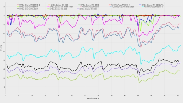 在2K分辨率DLSS质量模式下,实际渲染分辨率为1664 x 996,在本次实测中的13款显卡中,只有RTX 4060无法实现60 FPS的帧数表现。由于游戏具有120 FPS帧数限制,定位4K游戏的RTX 5090 D/D v2、RTX 5080、RTX 5070 Ti以及上一代RTX 4090 D、RTX 4080 SUPER全部撞墙,平均帧稳定120。