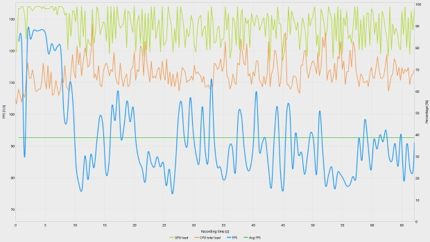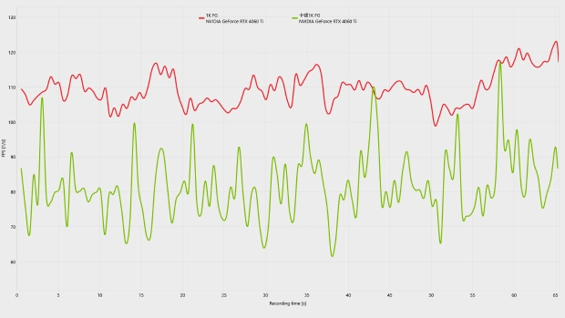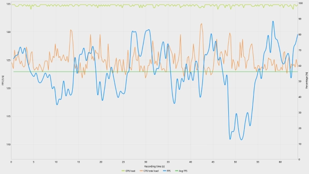 通过分析测试时硬件占用可以看到,未触发卡顿时,CPU占用基本稳定在60~70%,显卡占用全程满载非常稳定,但是发生卡顿后,CPU峰值占用多次冲上90%,显卡占用也开始抽风上下跳动。
