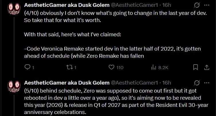 《生化危机》系列的知名爆料者Dusk Golem此前曾透露,《生化危机:代号维罗妮卡》将是今年公布的重制版游戏。如今他再次更新了这款尚未正式公布的重制版游戏的发售信息,称其发售窗口为2027年第一季度。
