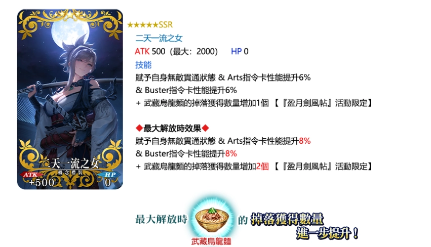 在本次联动活动「盈月剑风帖」装备上述3种限时概念礼装进行通关,将可提升对应「武藏乌龙麵」、「江户饭糰」及「东之柿饼」等活动道具的掉落获得数量。
