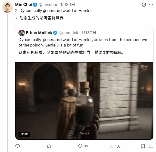 一位从事AI与AI教育行业的人士曾在推特上介绍谷歌新版Gemini3.0的强大功能,还展示了不少“生成游戏画面”的实例,其中就有将经典名著《哈姆雷特》改编成游戏画面的内容。
