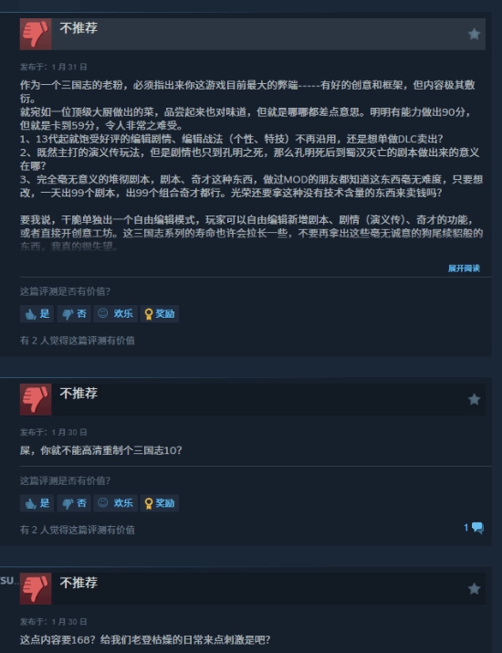 玩家们提出,这款游戏没有延续《三国志13》中已经很完善的剧情编辑和战法编辑功能,剧情只到“孔明之死”就结束了,像蜀汉灭亡这样的后续关键情节都没有包含在内;而新加入的虚构剧本也被吐槽是“毫无意义的拼凑”,有玩家开玩笑说“哪怕是做过MOD的玩家,一天都能做出99个这样的剧本,光荣却用这种没什么技术含量的内容来赚钱”。地图尺寸太小被看作是“致命的缺陷”,有玩家表示它甚至比不上《三国志11》《三国志12》的地图大小;新增加的内容不多,游戏的可玩度不够,因此被指责是“利用玩家的情怀来圈钱、割韭菜”;除此之外,游戏还存在闪退、战前卡顿出BUG等技术方面的问题,联机功能更新之后又限制了老账号登录,这让老玩家们的不满情绪更加严重了。168元的售价被认为和游戏“内容太少、优化不到位”的体验完全不匹配,有玩家直接说“就这点内容根本值不了这个价”。