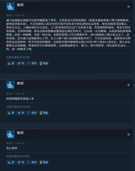 尽管争议较大,仍有部分玩家给出正面评价:战斗系统优化后,高难度模式下小势力也具备可玩性;新增武将 CG 提升了视觉体验,部分原版立绘的缺陷得到修正,一定程度上提升了沉浸感。部分玩家对官方后续优化抱有期待,提出 “加入编辑宝珠、新奇术、新 CG” 等建议,希望作品能通过更新补足内容短板。