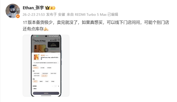 目前小米商城里REDMI Turbo 5 Max的1TB版本所有配色均已售罄,REDMI产品经理张宇称:“1TB版本的备货量非常少,卖完之后就不会再补货了,要是确实想购买,可以去线下门店咨询一下,或许部分门店还留有少量库存。”