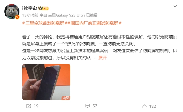 据数码博主“i冰宇宙”介绍,三星S26 Ultra采用物理防窥屏设计,在屏幕内部加入可控视角的光学结构,从物理层面收窄侧视可见范围。