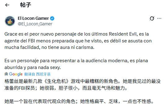 在《生化危机》官方账号的帖子下,格蕾丝同样遭到不少粉丝批评: