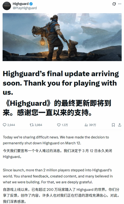 《巅峰守卫》官方推特账号@PlayHighGuard发布公告,宣布游戏服务器将于3月12日正式关闭。该游戏自1月26日正式上线至停服,运营时长约一个半月。