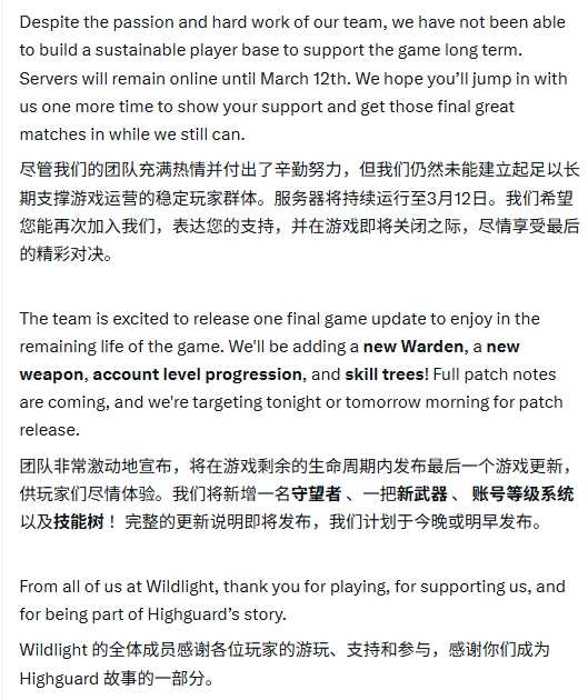 官方声明表示:“虽然团队倾注了大量心血与精力,我们还是没能构建起足以支撑游戏长期运营的稳定玩家群体。服务器会一直开放到3月12日。期待大家能在这最后的时光里再次回归,进行精彩的对战,和我们一起好好道别。”