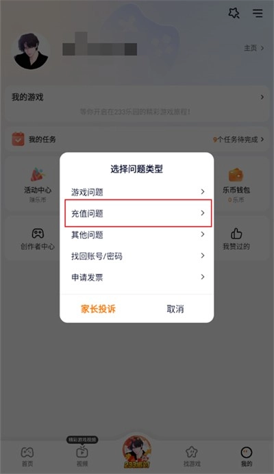 4、之后弹出问题类型选择,找到【充值问题】进行点击;
