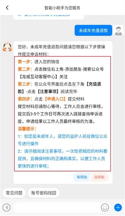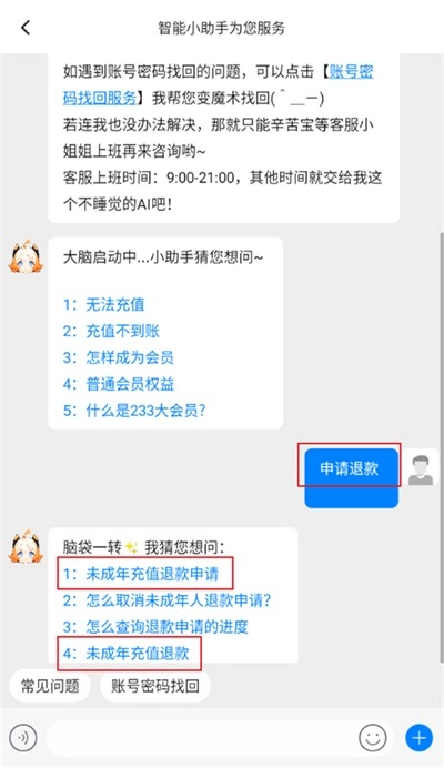5、进入客服功能界面,在这里输入申请退款选项进行发送,发送后智能客服会给你几个选项,选择其中的未成年退款选项;