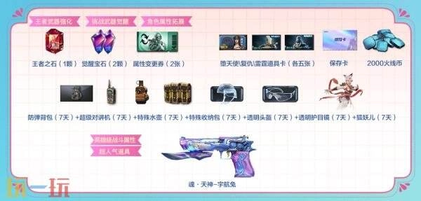 其他道具奖励:防弹背包(7天)、超级对讲机(7天)、特殊水壶(7天)、特殊收纳包(7天)、透明头盔(7天)、透明护目镜(7天)、狐妖儿(7天)、火线币*2000。