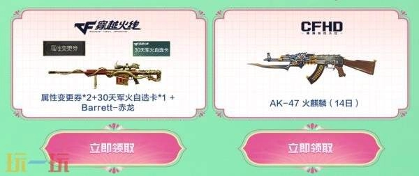 核心道具奖励:Barrett-赤龙、属性变更券*2、30天军火自选卡*1、AK-47-火麒麟(14日)(CFHD端奖励)。