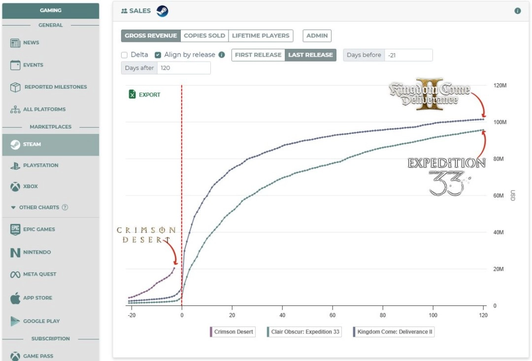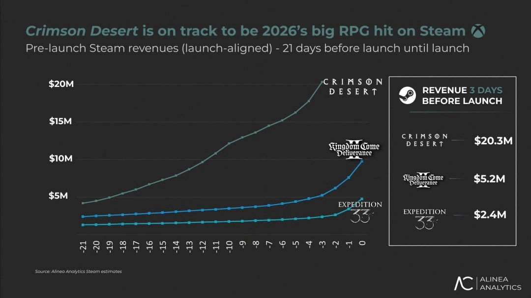 目前,《红色沙漠》已积累起堪称历史性的发售前用户基础。业内分析指出,若游戏品质能够达到预期水准,它很有希望成为继《光与影:33号远征队》和《天国:拯救2》之后,Steam平台在2026年推出的又一款营收突破1.5亿美元的现象级大作。