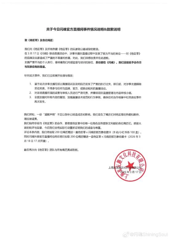 针对此恶劣影响,上海真友趣文化科技有限公司(闪魂官方)发布紧急致歉声明,向《绝区零》团队及全体玩家表达最深切的歉意。