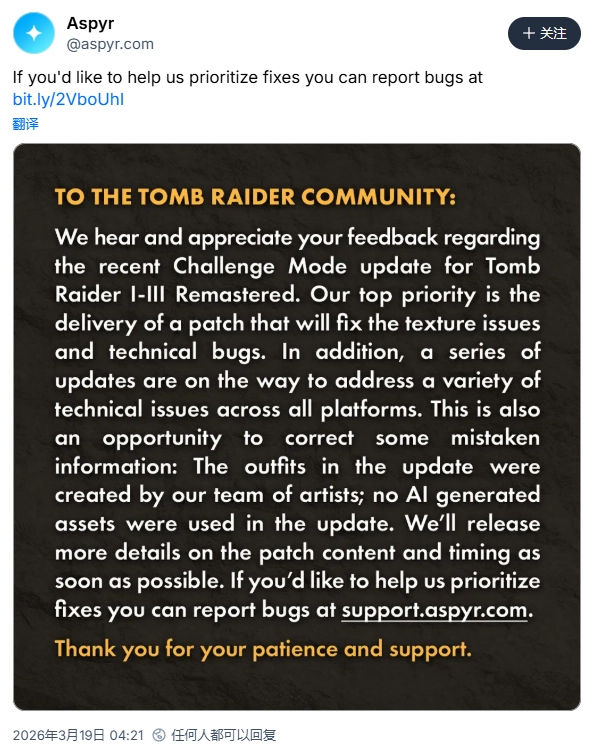 《古墓丽影三部曲:重制版》的开发商Aspyr于近日发表声明,针对近期更新的挑战模式里的新服装,否认其是由生成式AI制作的,同时表示会优先处理并修复此次更新所引发的技术问题。