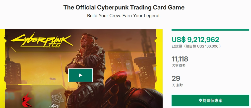 CDPR官方授权监制,基于《赛博朋克2077》及动画版改编的衍生卡牌游戏《Cyberpunk Trading Card Game》日前启动众筹,仅用5分钟就达成10万美元的目标金额,截至本文发稿时,一天内已获得920万美元的支持资金。