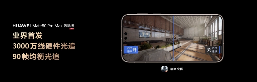 在现场演示热门竞技手游《暗区突围》时,HUAWEI Mate80 Pro Max风驰版所展示的3000万线硬件光追及业界首发90帧均衡光追体验,将PC级的光影艺术带到了方寸屏幕之间。
