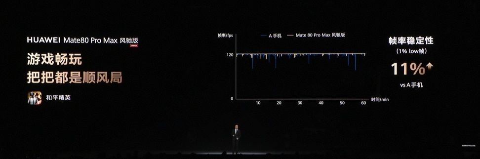 除了高清的画质,稳定的帧率同样是竞技类游戏取胜的关键。在国民级手游《和平精英》的演示中,HUAWEI Mate80 Pro Max风驰版展现了其在帧率稳定性上的巨大优势。凭借强大的散热与性能调度,其1%low帧相比业界其他产品高11%,让玩家告别“关键时刻卡顿”,降低输入延迟,瞄准、射击、跳跃、转向等每一个战场动作都能精准执行,决胜毫厘之间。
