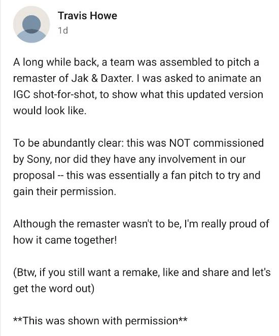 这段演示由 Sanzaru 的资深动画师 Travis Howe 公开。为了向索尼展示重制的潜力,开发团队完全按照原版的镜头,使用现代引擎 1:1 重制了一段游戏内过场动画: