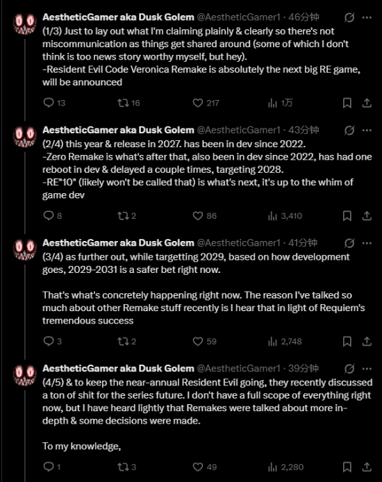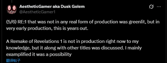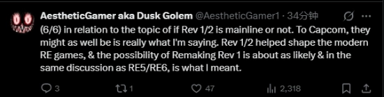 另外,他指出《生化危机1》重制版已获立项,但仍处于非常早期阶段,距离发售还有多年;《启示录1》重制版目前尚未正式开发,但曾被纳入讨论范围,其优先级与《生化危机5》《生化危机6》重制版处于类似层级。