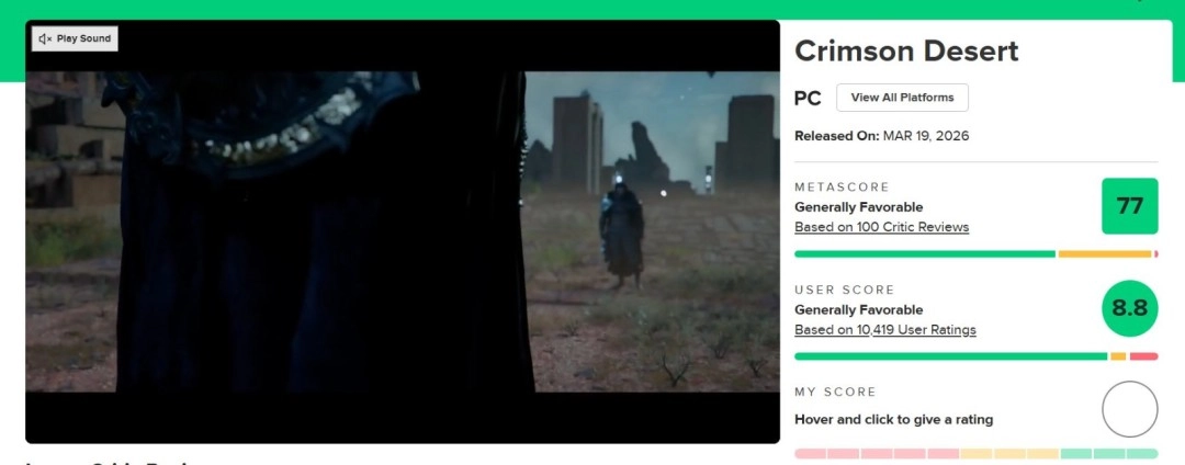 目前,《红色沙漠》已成为2026年玩家评分第二高的游戏,其8.8分的成绩超过《宝可梦Pokopia》的8.5分,仅次于《生化危机:安魂曲》的9.4分。不过,该游戏的媒体评分仍不理想,仅为77分(满分100分),在年度排行榜上位列第48位。需要说明的是,评论家最初给出的评价是基于游戏刚发布时的状态,当时游戏还存在较多问题。