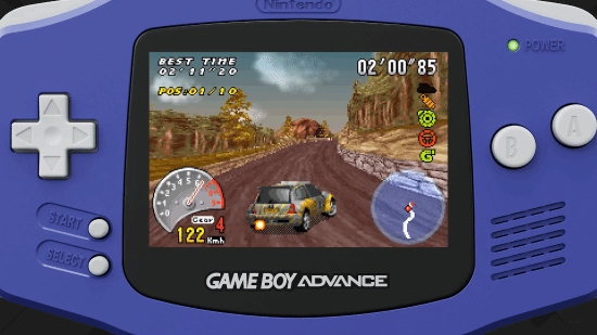 GBA作为一款16MHz处理器的掌机,本是为2D游戏量身打造。然而,经典赛车游戏《越野英雄3》却在这台小设备上实现了全 3D赛道的运行效果,拥有真实的高度与深度,毫无PS1风格的简洁画面却带来了极佳的速度感与驾驶氛围。