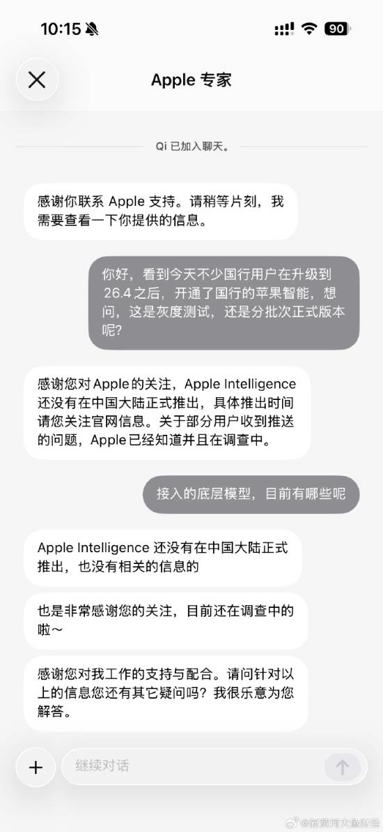 今天凌晨,苹果向已升级至iOS 26.4系统的国行iPhone用户,推送了Apple Intelligence Beta版(即苹果智能)。