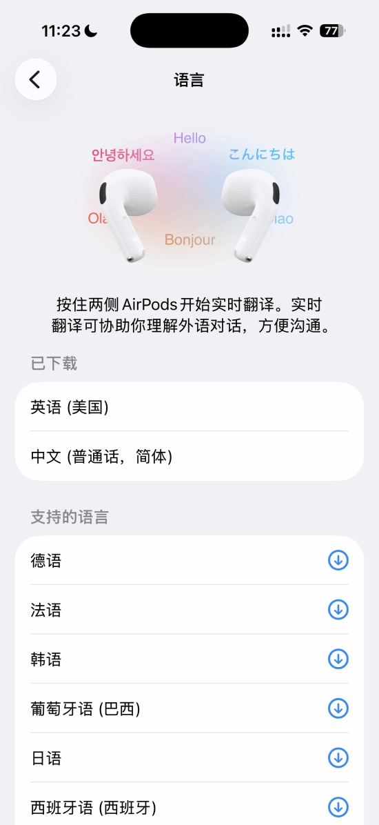 进一步实测还发现,在开启苹果智能后,AirPods将支持实时翻译功能,用户只需按住耳机两侧即可快速启用。