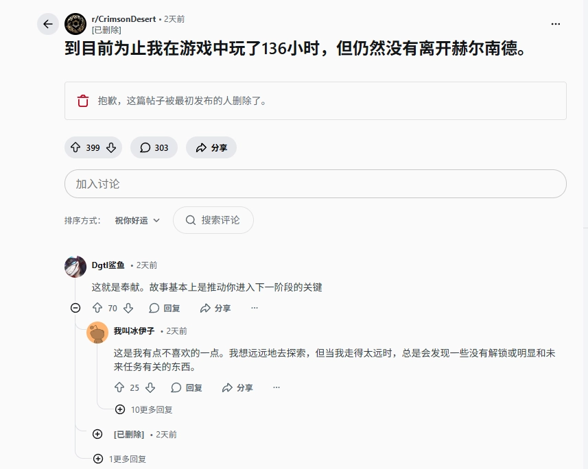 在Reddit《红色沙漠》子版块中,一位玩家发帖称:“目前游戏时长136小时,还没离开赫南德。”按发售时间计算,该玩家日均游戏时长约为13小时。尽管该数据可能包含夸张成分,但帖子获得大量玩家共鸣,反映出游戏首个区域的内容量远超部分玩家预期。