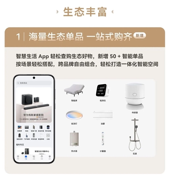 鸿蒙智家的生态也进一步扩充,智慧生活App新增五十多款智能单品,可以跨品牌自由搭配,一站式配齐全屋智能。