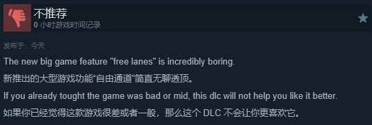 差评方面,部分玩家觉得这款DLC“差劲、乏味”,也有玩家提到存在本地化配音出错的情况。