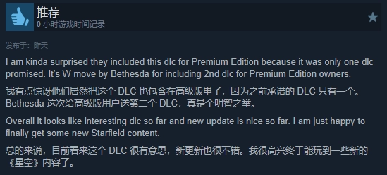 不少好评玩家都特别提到,这款DLC对当初购买高级版的玩家免费开放,这种做法值得夸赞,并且认为这一DLC使得《星空》更贴近当初发售时的承诺了。