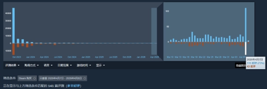 4月7日当天,这款游戏在Steam商店收到了141份评价,单日好评率达73%,评价等级为“多半好评”。不过要说明的是,因为游戏更新时间是北京时间4月7日夜间,所以这些数据里可能夹杂着部分更新前的评价。但从近期整体数据来分析,绝大多数评价应该都是在更新之后提交的。
