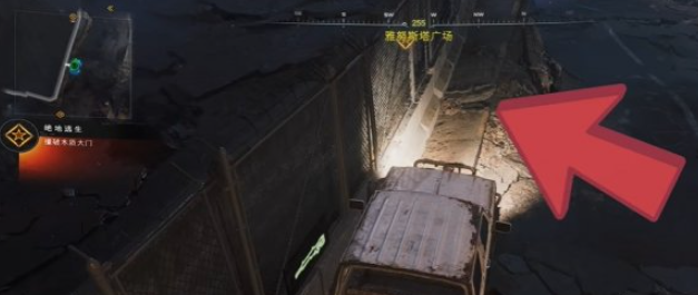 第一步:驾驶卡车,将车头对准下图所示位置,从卡车侧后方以约45度角撞击,使两车形成“卡模型”状态。