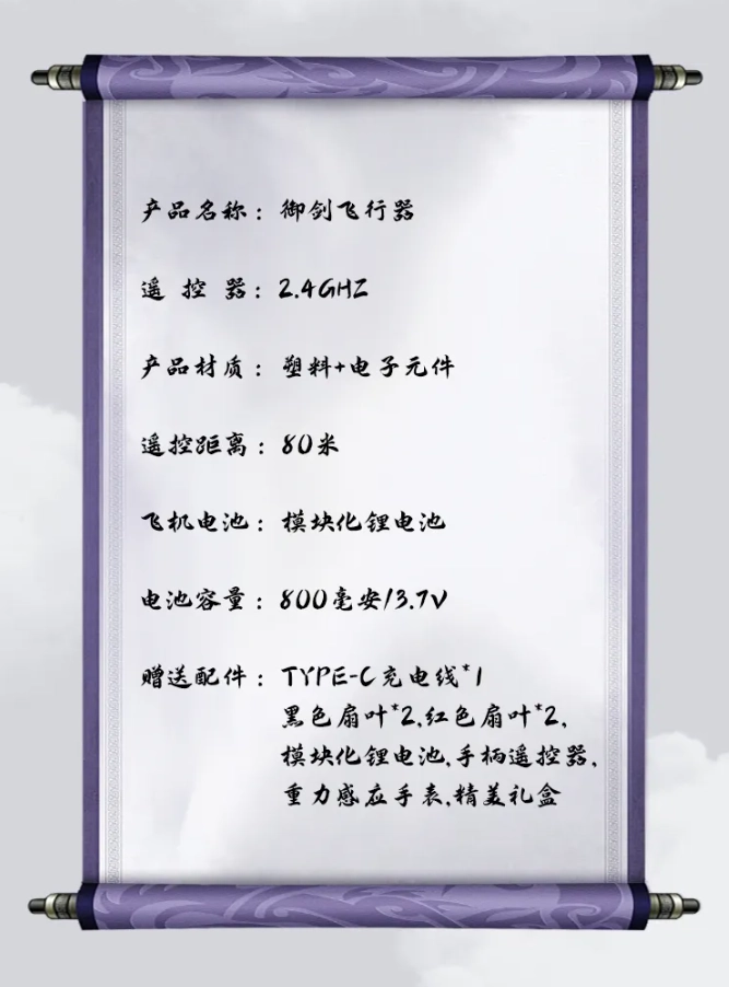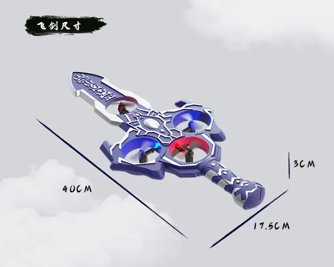 这款飞行器其实就是特殊形态的无人机,精准复刻《仙剑奇侠传三》中魔剑的经典形态,紫色剑身镌刻古姜文字,长度40厘米。其采用四个机翼结构,模块化锂电池,遥控距离可达80米,科技与侠气兼备。支持重力感应+手柄双遥控,快慢两挡可调,不但能控制前进方向,还可一键实现360度翻滚,支持“一键急停” 。