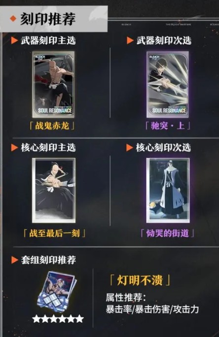 核心刻印肯定要使用能够更加突出角色战斗力的刻印了,那和斑目一角最为匹配的核心刻印就是战至最后一刻,这个刻印能够让斑目一角的所有技能强度都能得到提升,而且自身的暴击伤害也会得到增强,核心刻印次选建议选择恸哭的街道,这个核心刻印虽然是白哉的专属核心刻印,可是若斑目一角没有拿到站至最后一刻的话,恸哭的街道也是一个不错的选择。