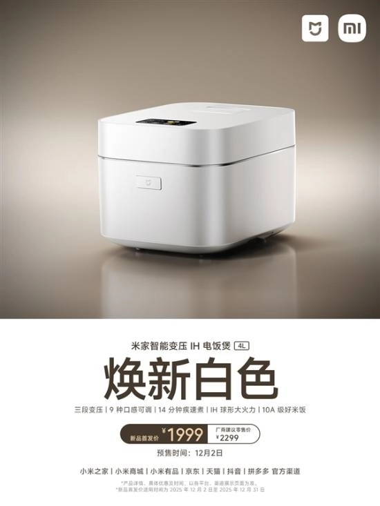 今年9月,小米推出了一款高端电饭煲产品——米家智能变压IH电饭煲4L,其建议零售价为2299元。